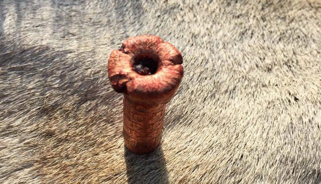 I noticed that there were no exit wound and went about looking for the Peregrine .375 300gr point. I recovered it under the skin on the opposite side and the result was amazing. The bullet passed through the centre of both ribs and still had perfect form. I couldn’t be happier with the result.